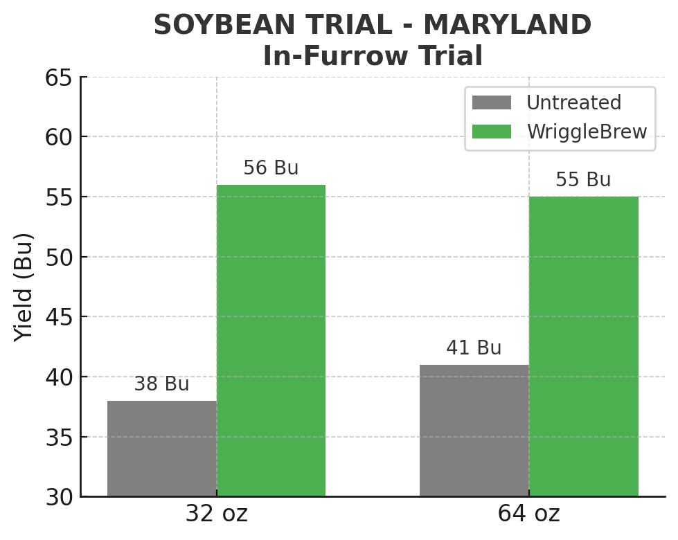 Soy grown with WriggleBrew in Maryland showed massive increases in yield at a rate of only 32oz to the acre.
