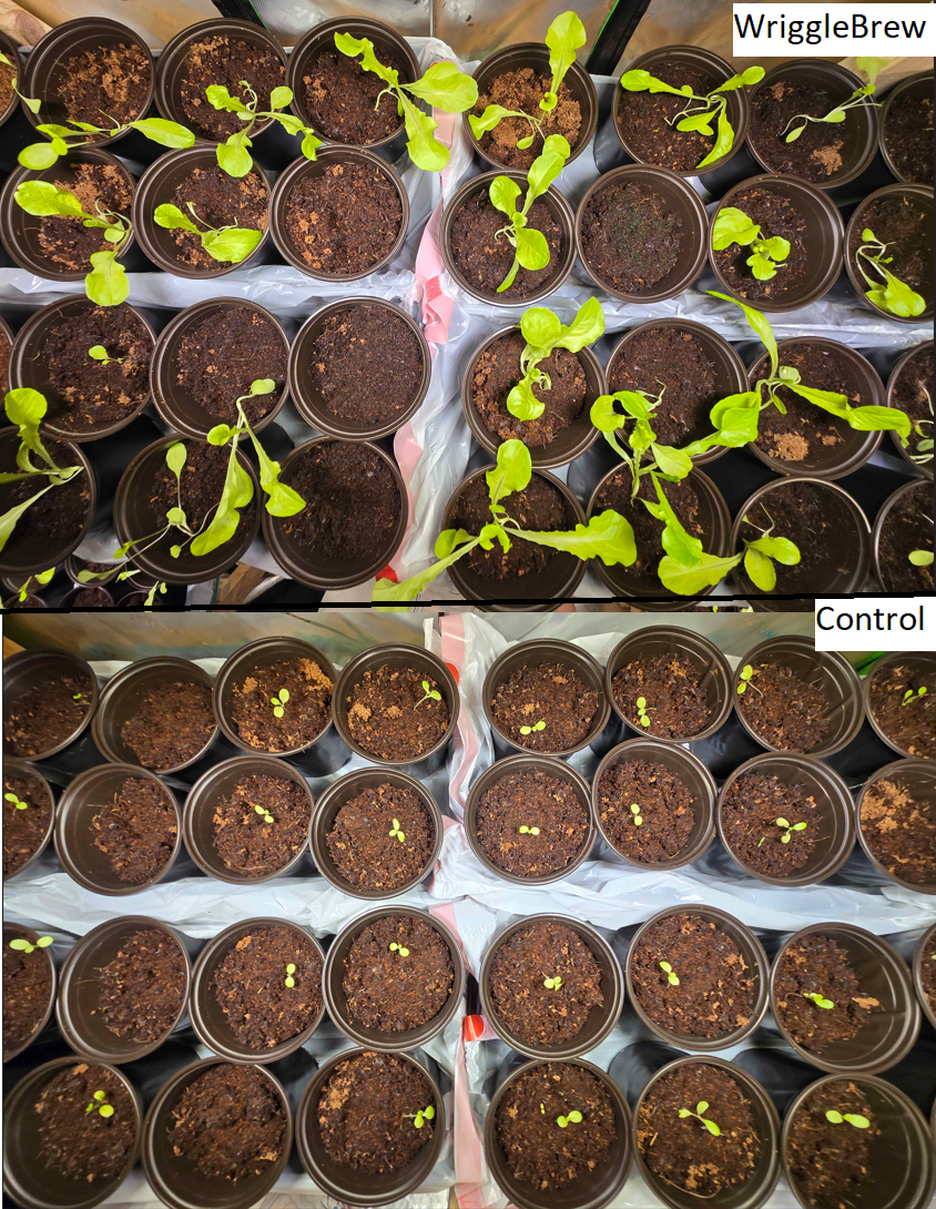 Among lettuce starts, those treated with WriggleBrew are both larger and far less likely to wilt than their untreated counterparts.